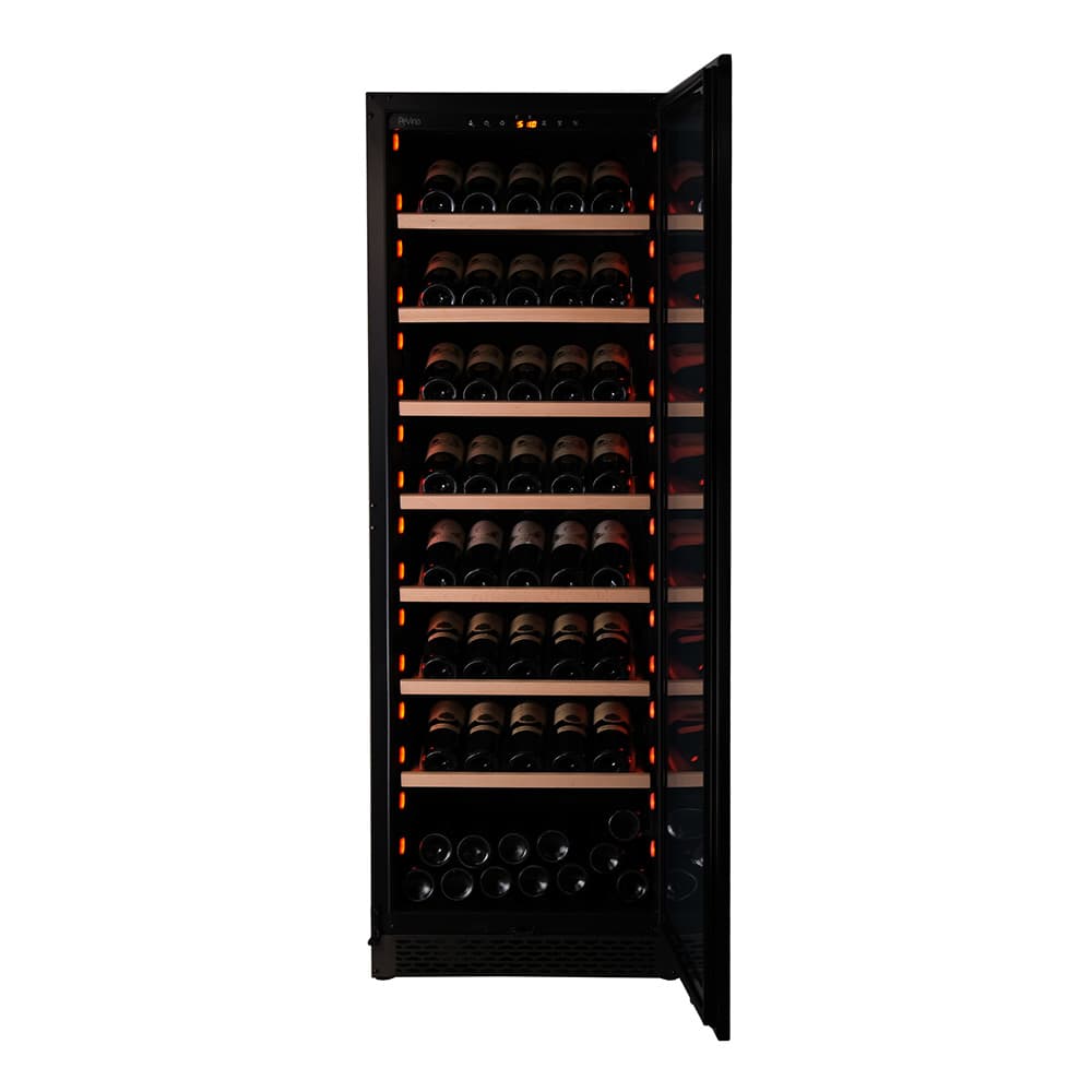 Pevino Majestic for 159 bottles is made for passionate wine collectors. Single zone (5-20°C) with 7 fully extendable beech wood display shelves and LED lights (white, blue, orange) for optimal storage and visual appeal.